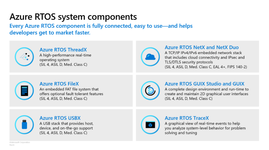 Azure RTOS es un sistema operativo en tiempo real diseñado expresamente para dispositivos con MCU de escasa capacidad de memoria. Destaca por ser ideal para la programación de dispositivos profundamente insertados, tener una capa pequeña de funciones a llamadas internas lo que hace que tenga un buen rendimiento, además de contar con una API intuitiva. Microsoft Azure IoT pone a nuestra disposición, además, un SDK para dispositivos profundamente insertados basados en MCU a nivel de Middleware de Azure RTOS como pueden ser sensores, entre otros SDK que mencionaremos más adelante.