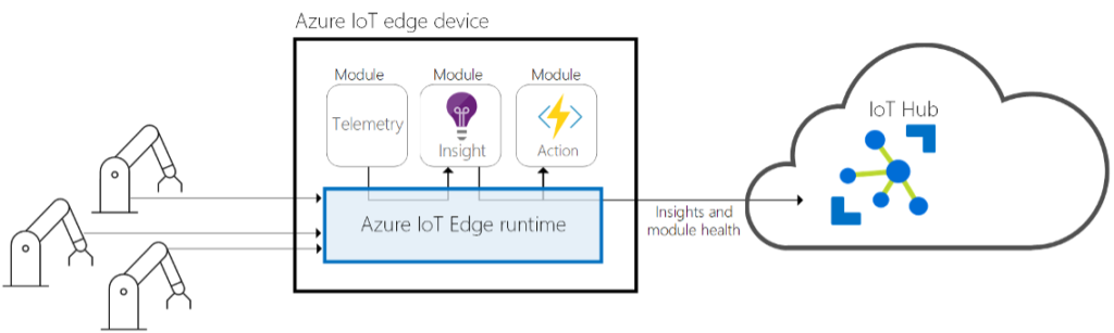 Por otra parte, el entorno en tiempo de ejecución se encarga de mantener los dispositivos conectados a la red de IoT Edge actualizados y seguros, de informar de su estado, instalar cargas de trabajo y garantizar las conexiones dentro de la red, a través de los agentes de IoT Edge.