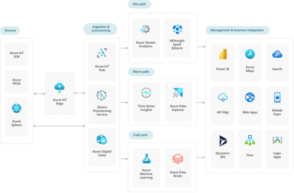 Además, Azure IoT cuenta con IoT Digital Twins, un servicio para el modelado de gemelos digitales con el que puedes diseñar redes enteras de dispositivos, orquestar el procesamiento de eventos y comprobar el estado de los dispositivos.