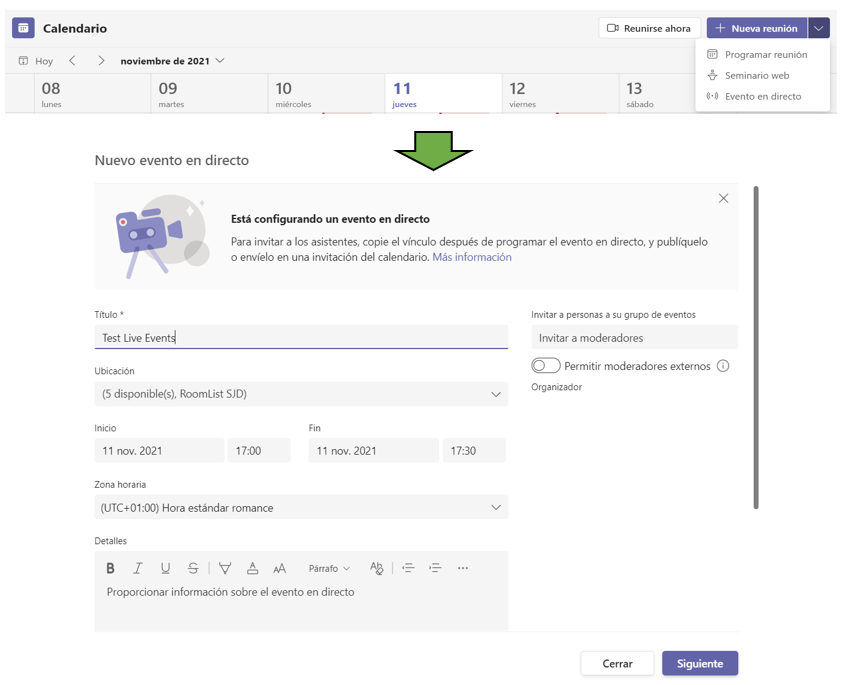 Si necesitas convocar reuniones con una audiencia muy amplia, y/o con varios ponentes debes utilizar Live Events.